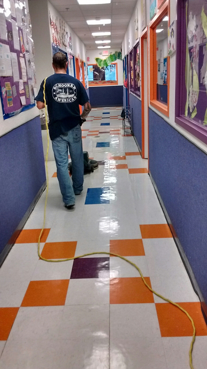 We also offer a follow up to burnish the floors monthly. We use a high-speed burnisher that healthcare facilities use to maintain a high gloss shine. When working on a childcare center, we prefer to do this during the weekend when we can have the necessary time to remove all furniture, strip the floors properly, and then lay six coats of high-quality floor finish.